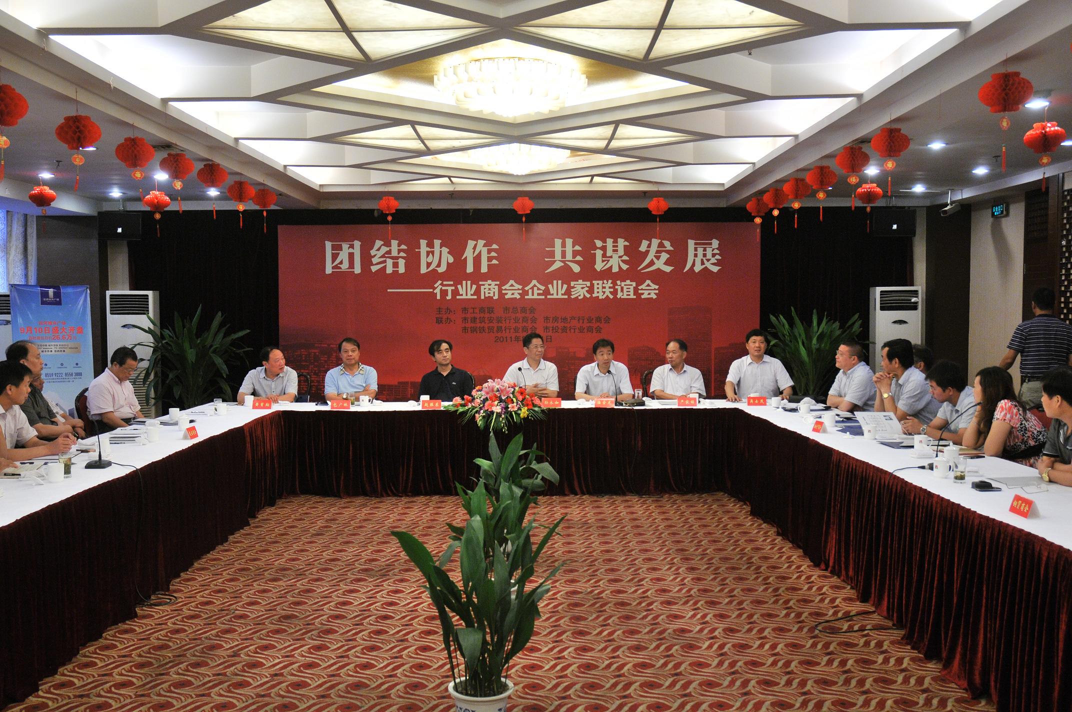 8月31日下午,由市工商聯(lián)、市總商會主辦,市建筑安裝行業(yè)商會、市房地產(chǎn)行業(yè)商會、市鋼鐵貿(mào)易行業(yè)商會、市投資行業(yè)商會聯(lián)辦的“團(tuán)結(jié)協(xié)作、共謀發(fā)展——行業(yè)商會企業(yè)家聯(lián)誼會”在怡園飯店隆重舉行,市人大副主任、市工商聯(lián)主席、市總商會會長孫永如,市委統(tǒng)戰(zhàn)部副部長、市工商聯(lián)黨組書記、副主席、總商會副會長趙振東出席會議,四個商會的會長、副會長、秘書長以及企業(yè)家代表近50人參加聯(lián)誼,揚州日報、揚州晚報、揚州電視臺等新聞媒體進(jìn)行了報道。