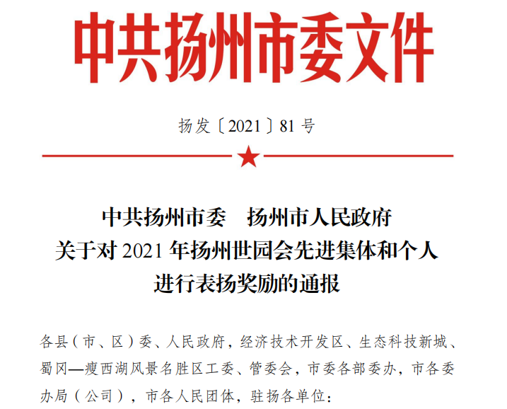 近日,揚(yáng)州市委市政府通報表彰2021年揚(yáng)州世園會先進(jìn)集體和個人,建工控股公司榮獲記“三等功”單位。華...